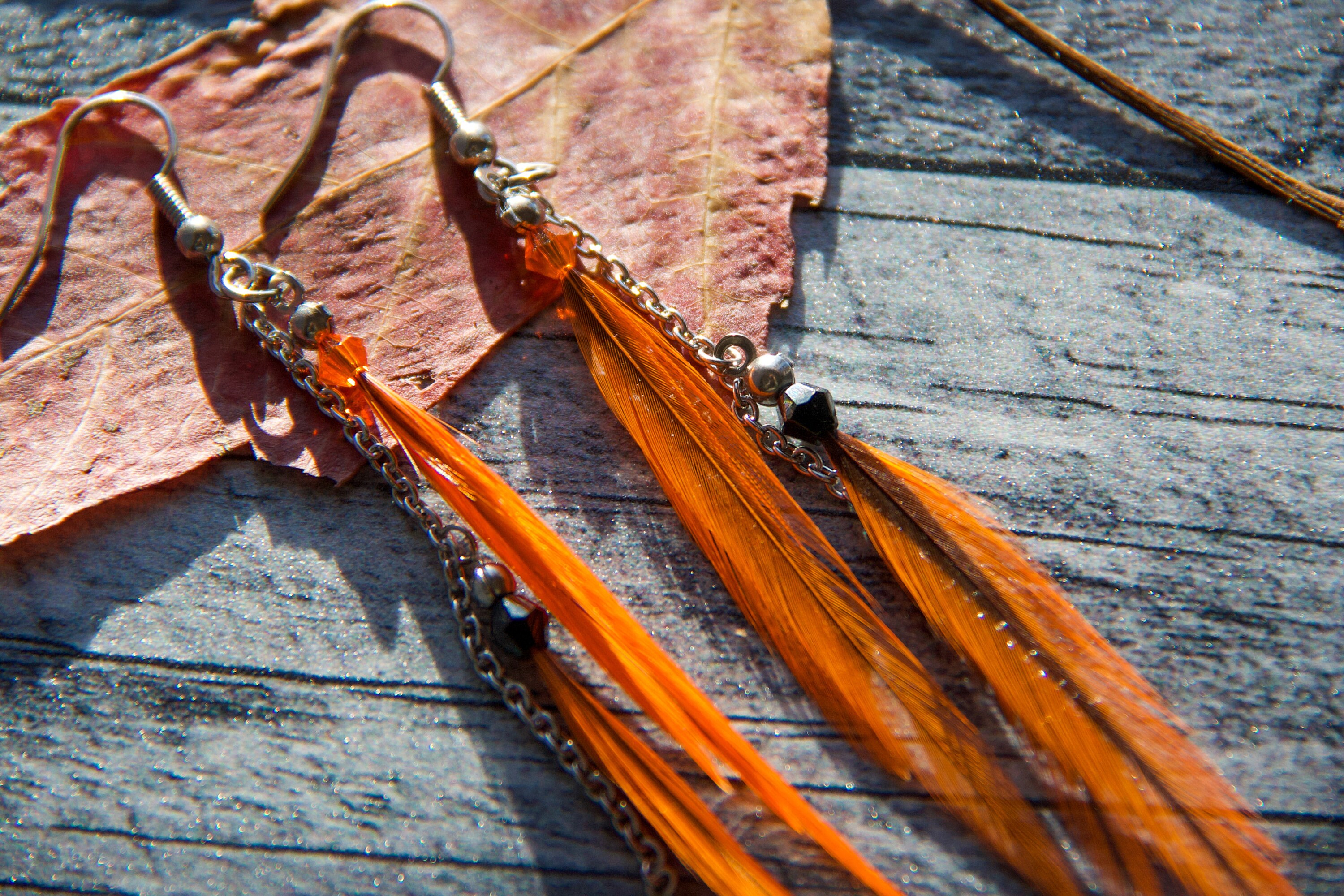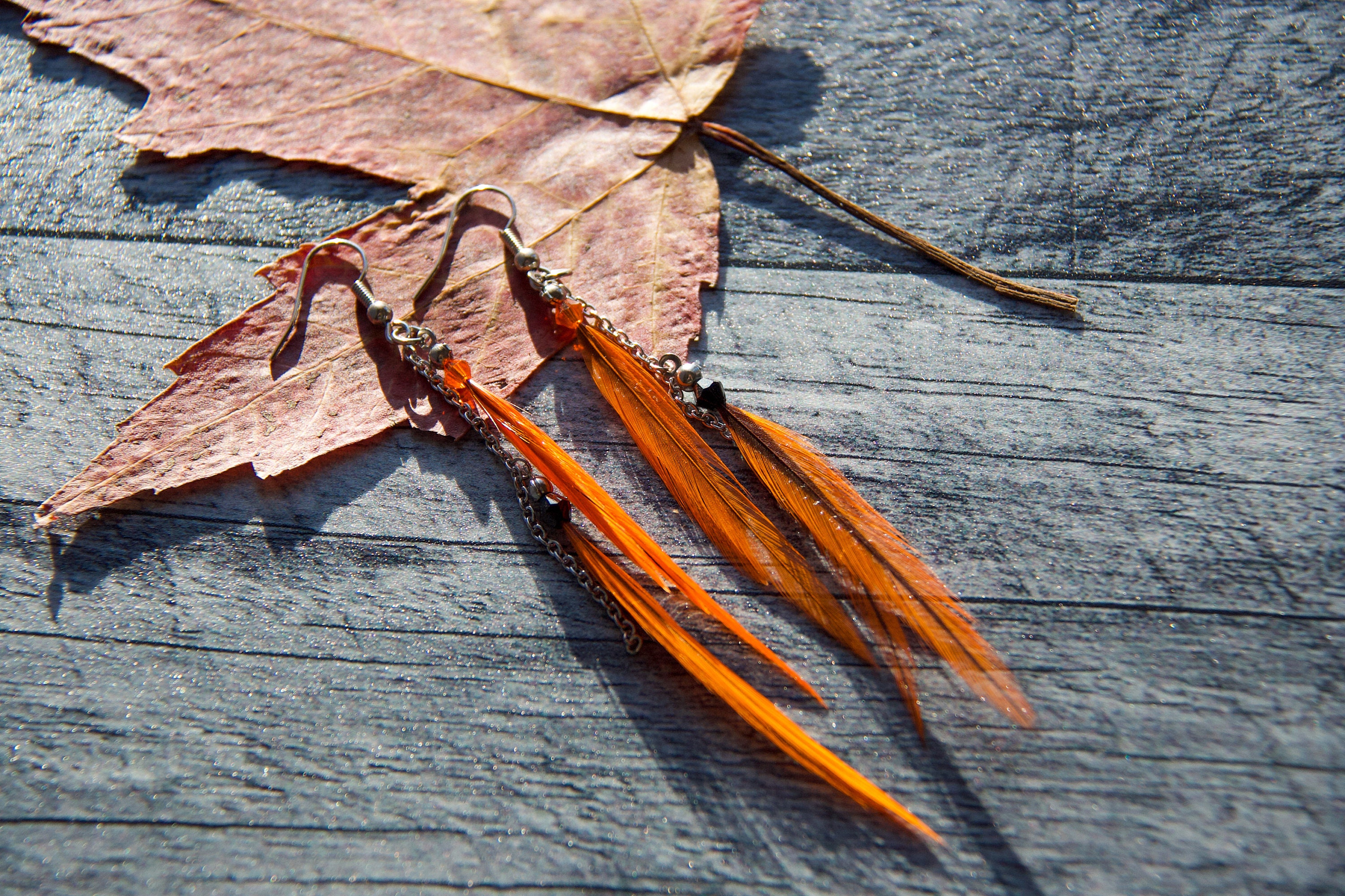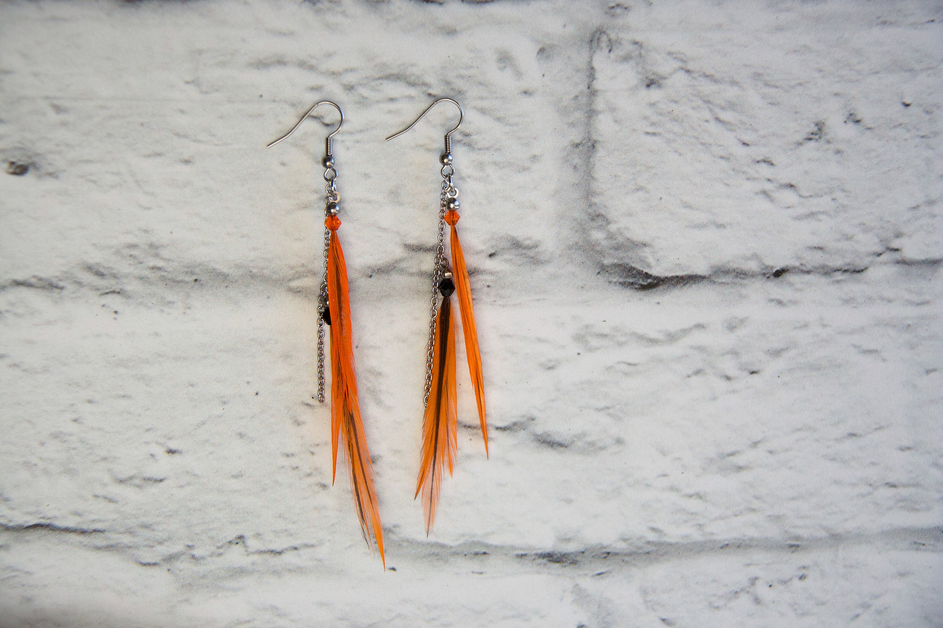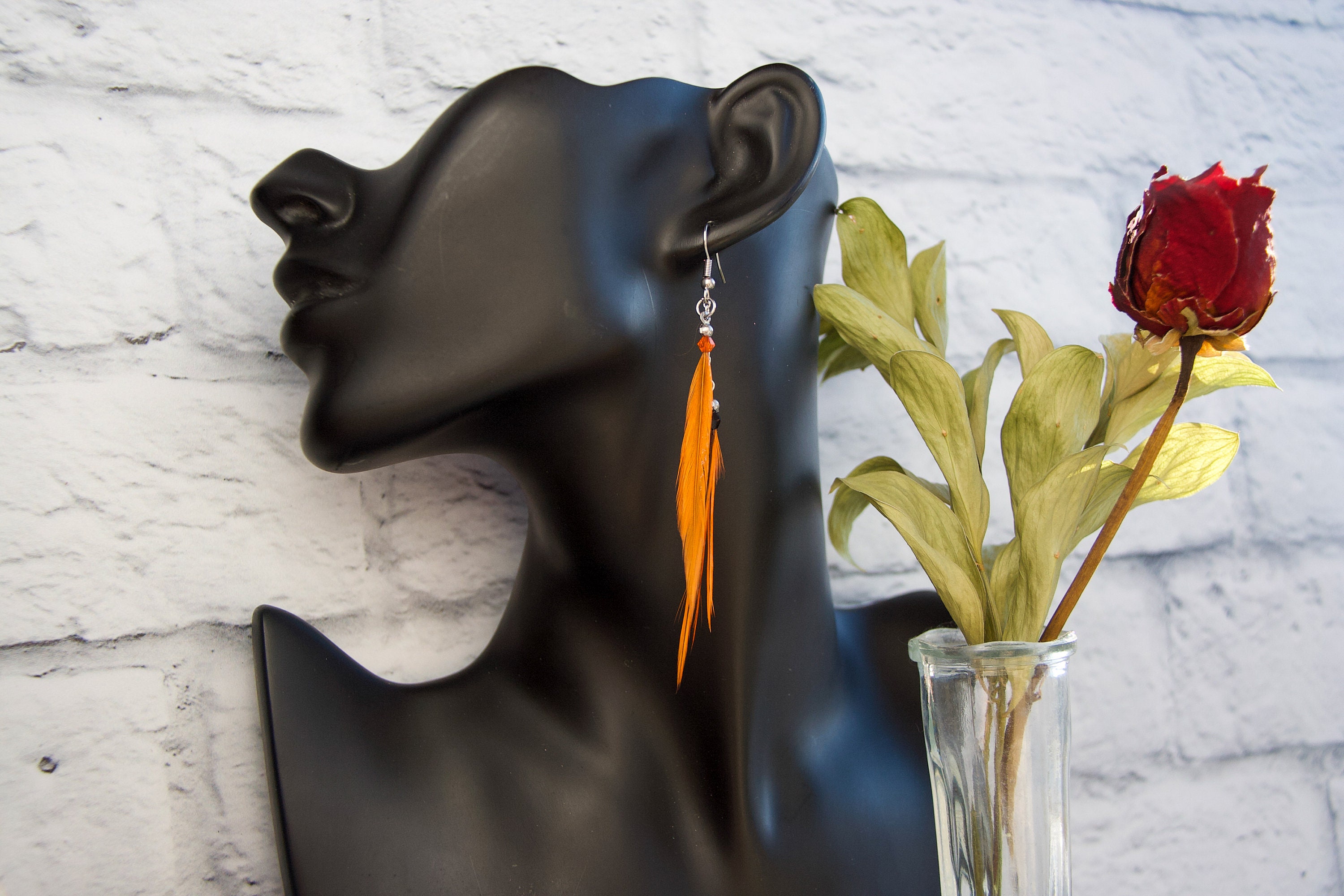 Elegant pendant asymmetric earring, made of nice long orange feathers decorated with Swarovski style beads.