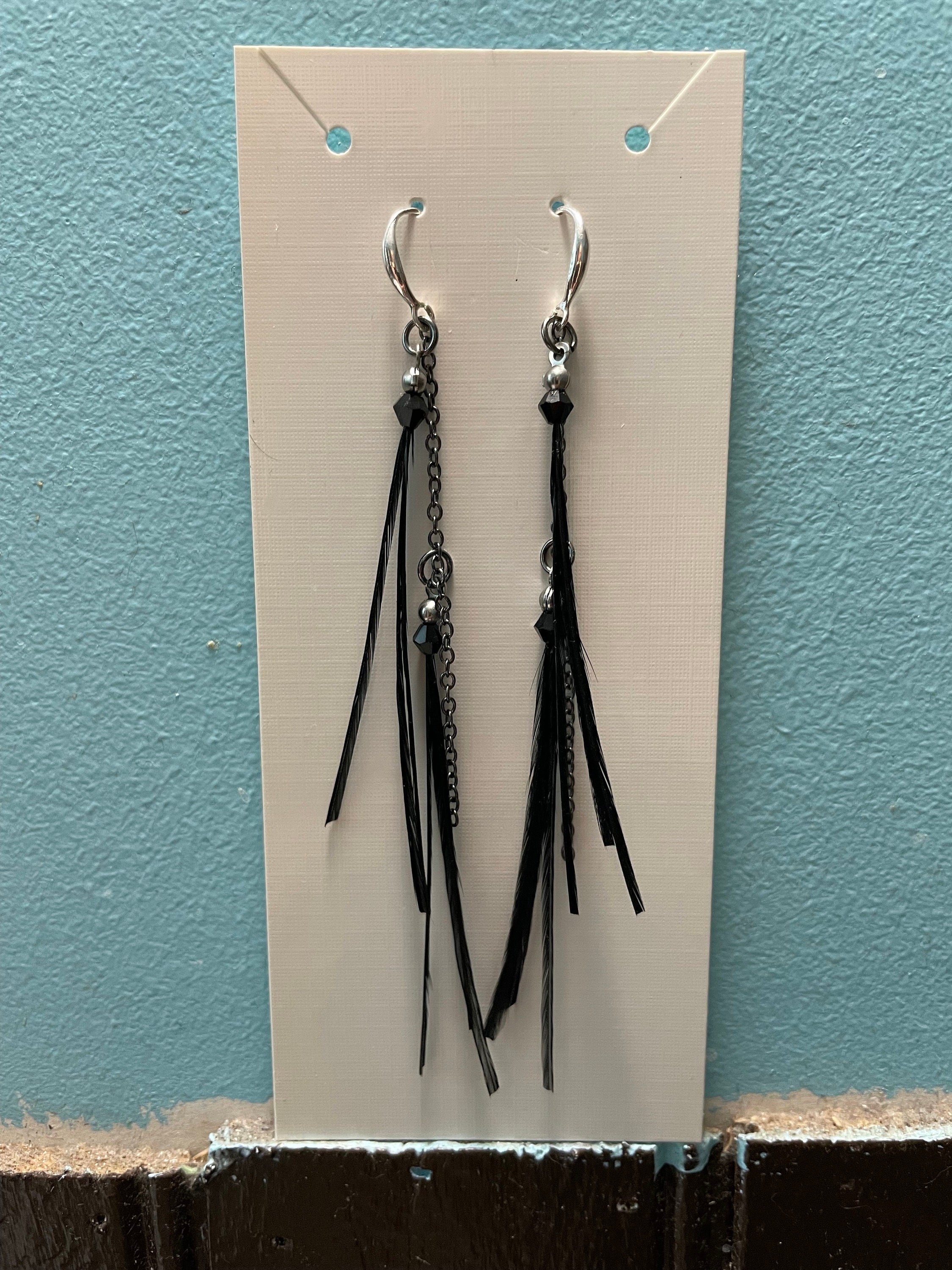 Elegant pendant asymmetric earring, made of nice long black feathers decorated with Swarovski style beads.